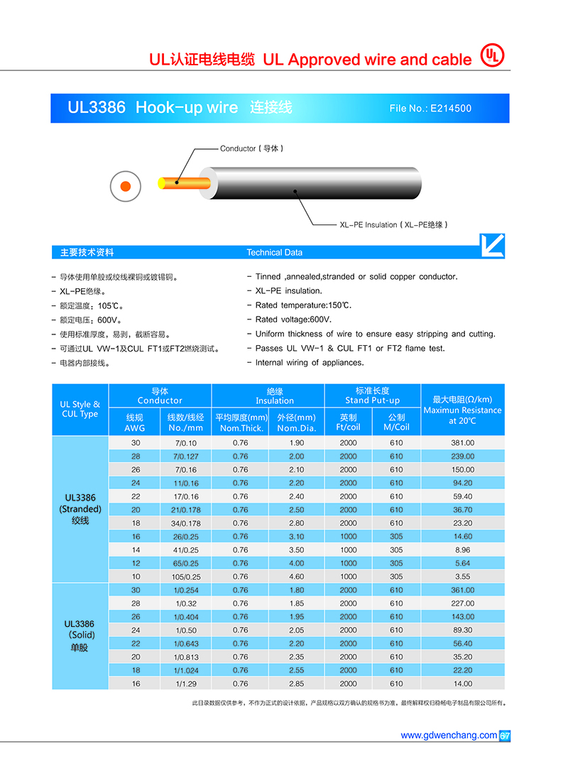东莞市稳畅电子制品有限公司是一家专业的UL3386 XL-PE电子线生产厂家,主营:UL3386 XL-PE电子线!所有产品都是按照质量管理体系和环保管理体系实行严格控制管理.