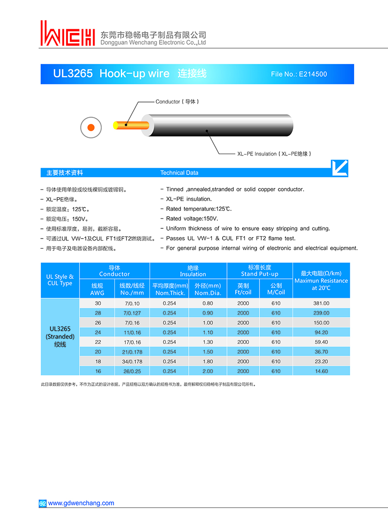 东莞市稳畅电子制品有限公司是一家专业的UL3265 XL-PE电子线生产厂家,主营:UL3265 XL-PE电子线!所有产品都是按照质量管理体系和环保管理体系实行严格控制管理.